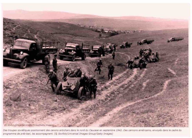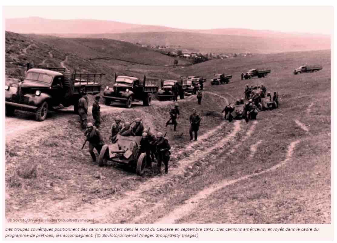 Staline, aurait-il capitulé en 1942 s’il n’avait pas obtenu une aide extérieure immédiate ? L’URSS aurait-elle pu habiller son armée, la chausser, la nourrir, la transporter et l’équiper sans la livraison de millions de chaussures, de millions de tonnes de produits céréaliers, de milliers de locomotives, de wagons et autres matériels roulant ? L’Armée rouge aurait-elle pu assurer la liaison tactique entre ses troupes dispersées sur plusieurs fronts sans avoir reçu 38 000 émetteurs-récepteur radio et des dizaines de millions de kilomètres de câbles ? L’état-major de Staline, pouvait-il penser sérieusement à assurer la sécurité aux frontières nord, surtout à Mourmansk, son principal port d’approvisionnement, sans avoir obtenu des États-unis la mise à sa disposition exclusive de 735 bateaux et navires de guerre ? La bataille de Stalingrad aurait-elle pu constituer un tournant dans la guerre sans la technologie états-unienne, sans que les 10 divisions russes, organisées dans le plus grand secret loin de Stalingrad, puissent être déplacées en camions Ford, Dodge et Studebaker sur plusieurs centaines de kilomètres en une seule nuit ? Et enfin, l’Armée soviétique aurait-elle pu ensuite devancer les armées alliées dans plusieurs pays de l’Europe centrale, sans les 409 000 camions et autres véhicules de transport rapide états-uniens ?