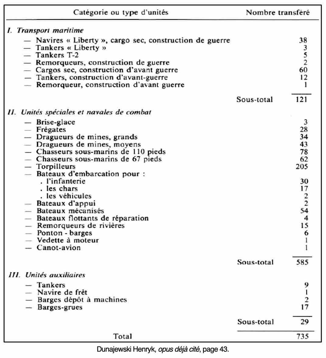– La sixième catégorie comprenait des équipements industriels, énergétiques et une quantité importante de matières premières stratégiques [23] : Charbon, fonte, acier, aluminium etc. Les États-uniens livrèrent également toutes sortes d’équipement industriel et divers outils dont la valeur s’élevait à 1,1 milliard de dollars.