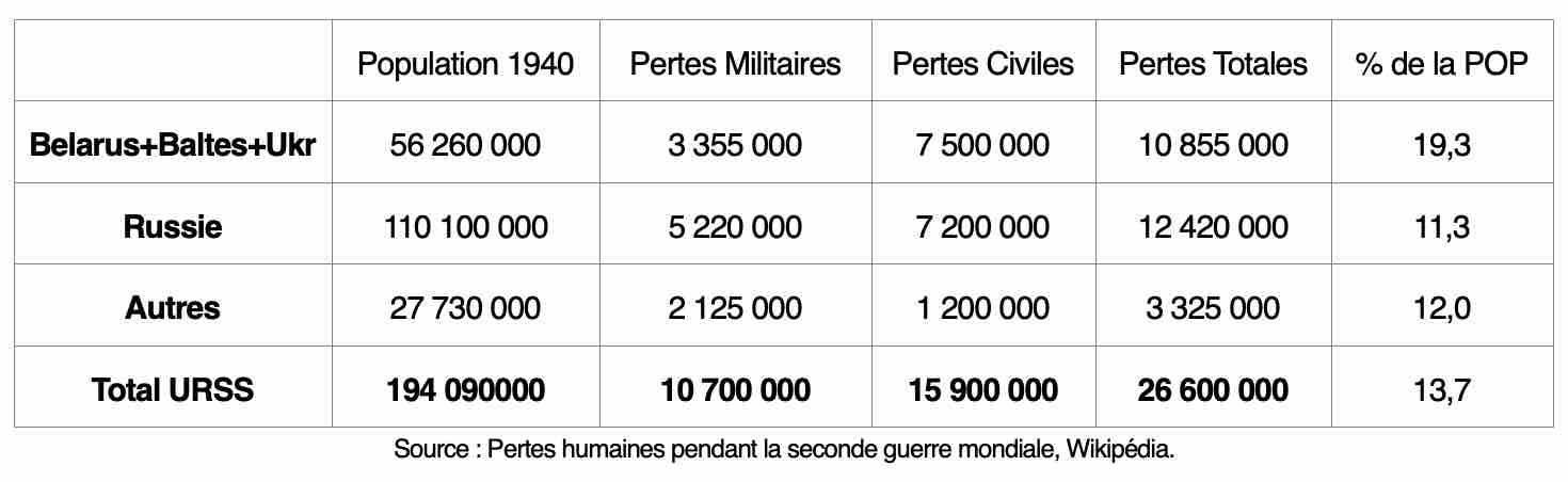 Les sources officielles de l’URSS et celles de Poutine font toujours état de 20 à 26 millions de pertes humaines (tués, blessés et disparus). En l’absence d’un consensus solidement établi à ce propos, c’est ce chiffre que nous prendront par défaut [17]. Par ailleurs, il donne à penser que ces pertes furent essentiellement russes. Les données et les archives étant dispersées, encore closes, perdues, falsifiées ou détruites, il est difficile de se faire une idée précise des pertes humaines (civiles et militaires) selon les nationalités composant l’URSS à cette époque. En 1940, elle comptait 194 millions d’habitants au total. Si l’on part du chiffre revendiqué de 26 millions de soviétiques disparus, cela représente environ 13,7% de l’ensemble de la population.